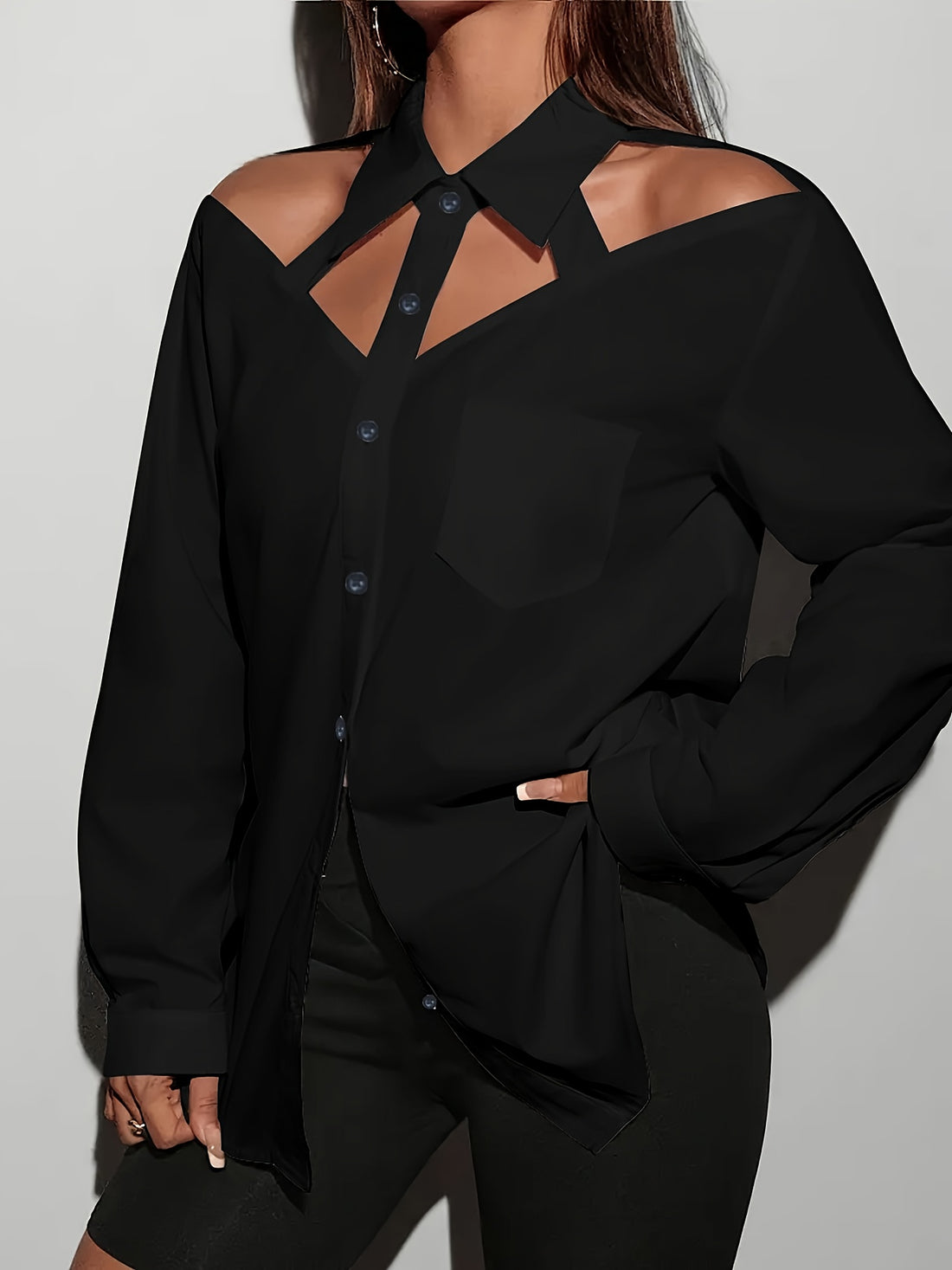 Elegant Shirt with a Hollowed-Out Collar, Solid Color Button-Up Shirt