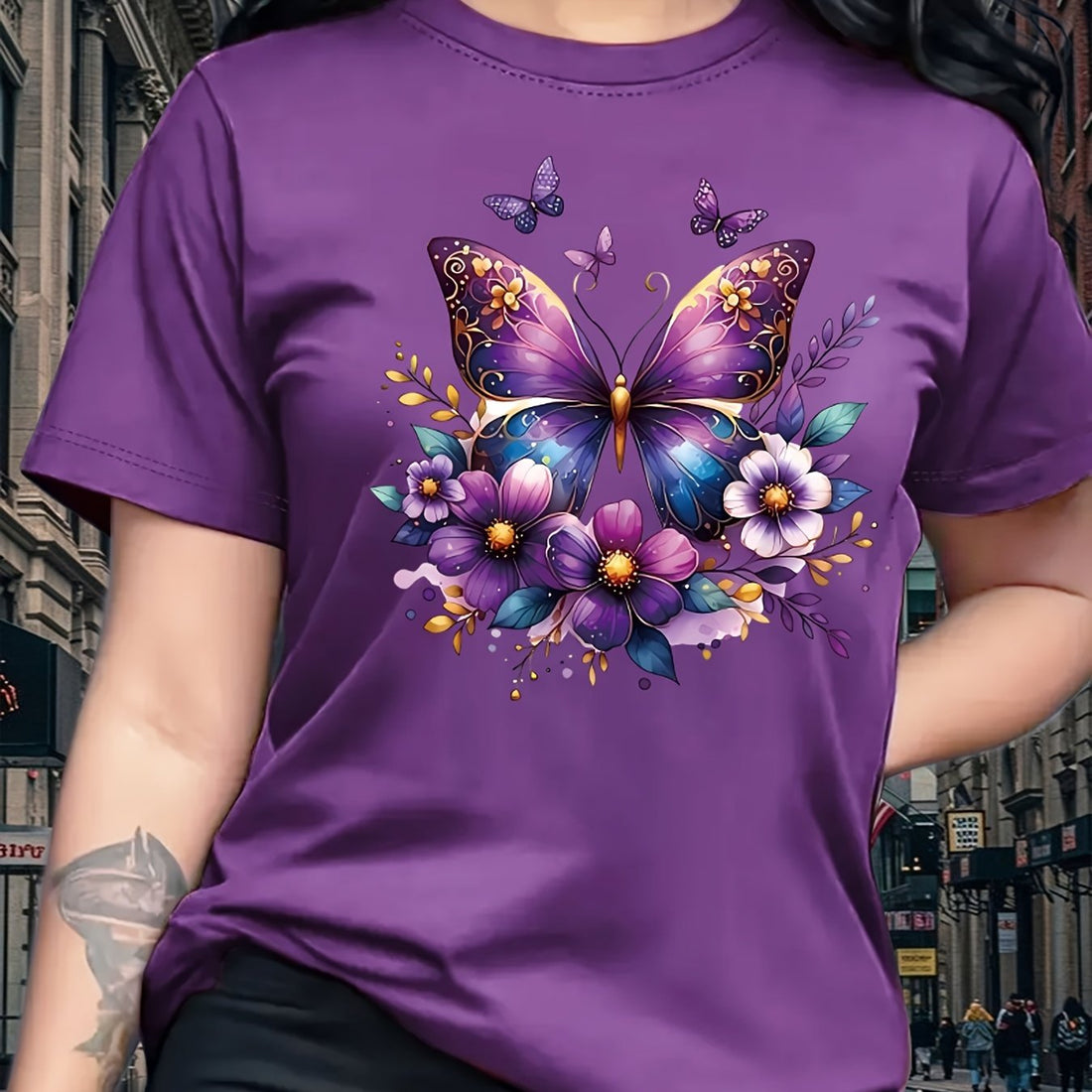 Round Neck Short Sleeve T-Shirt with Romantic Floral and Butterfly Print