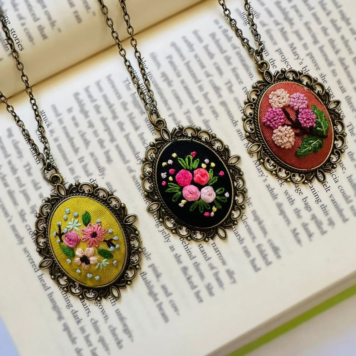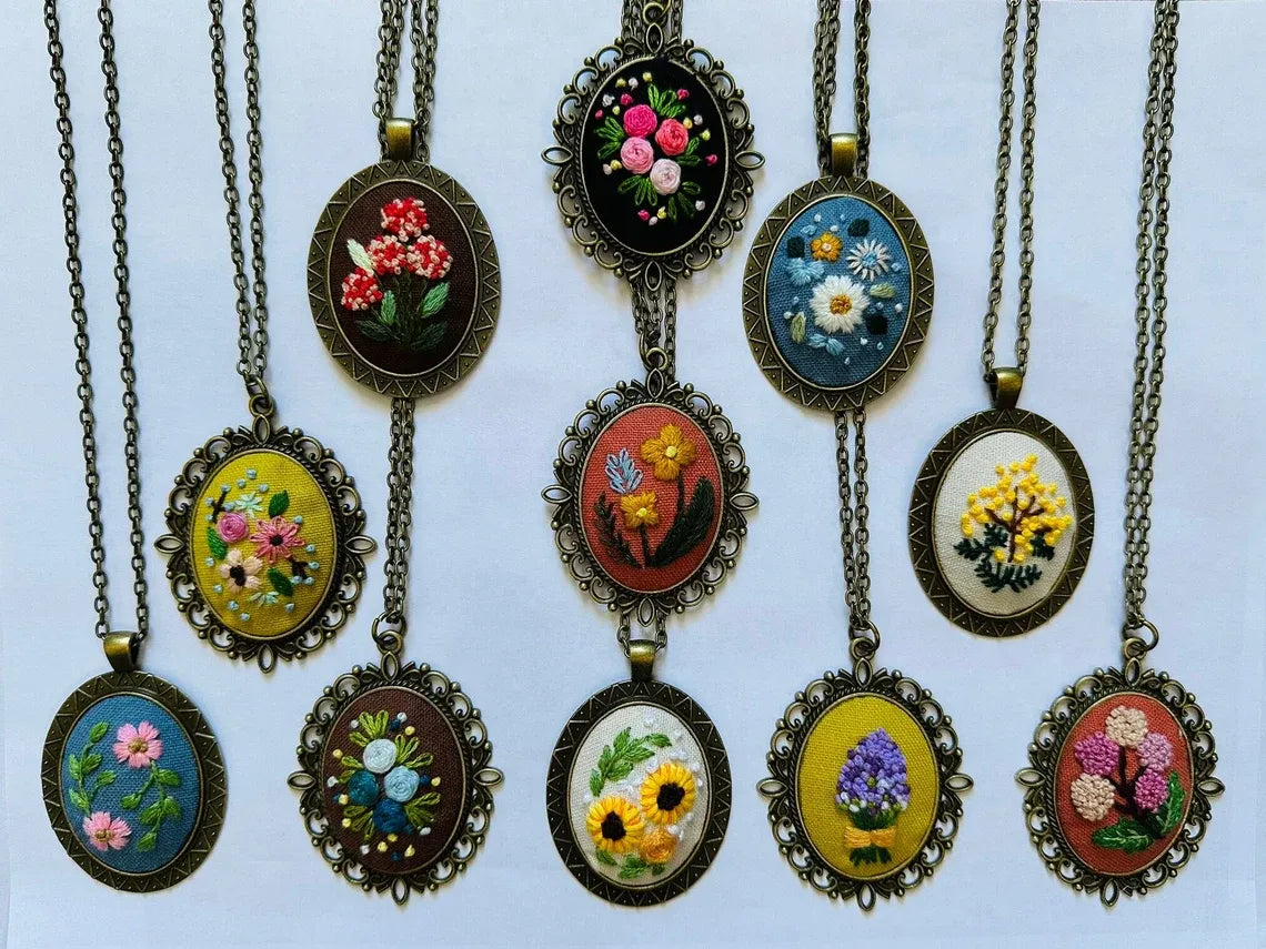 Elevate your style with this exquisite collection of hand-embroidered pendant necklaces, each a masterpiece of intricate craftsmanship. These timeless accents are not just accessories; they're statements that effortlessly elevate any outfit.