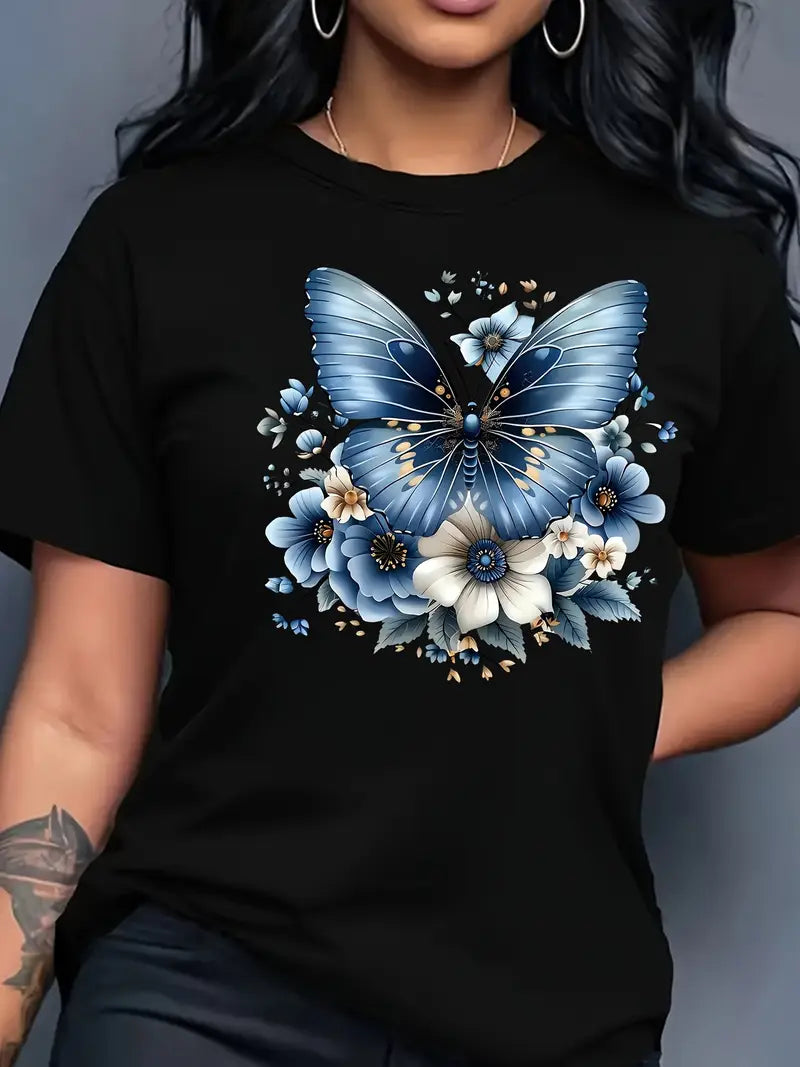 Vibrant Pink Butterfly & Floral Print Women T-Shirt