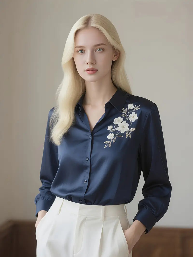 Women'S Elegant Blouse - Soft Satin-like Texture, Classic Collar Button-Up Shirt for Wedding Guest, Office, Party - All-Season Formal & Everyday Tops