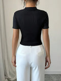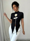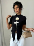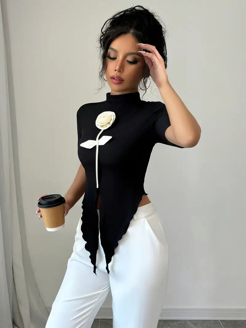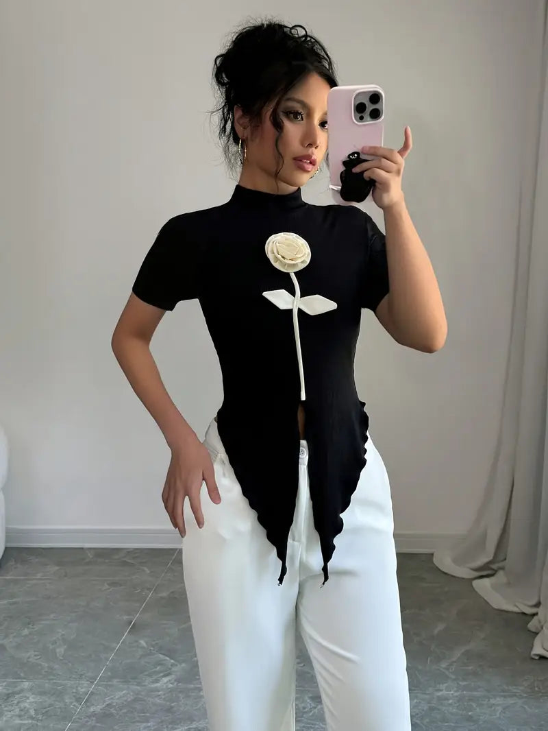 Women's Elegant Floral Appliqué Asymmetrical Hem Short Sleeve Top - Black & White Contrast
